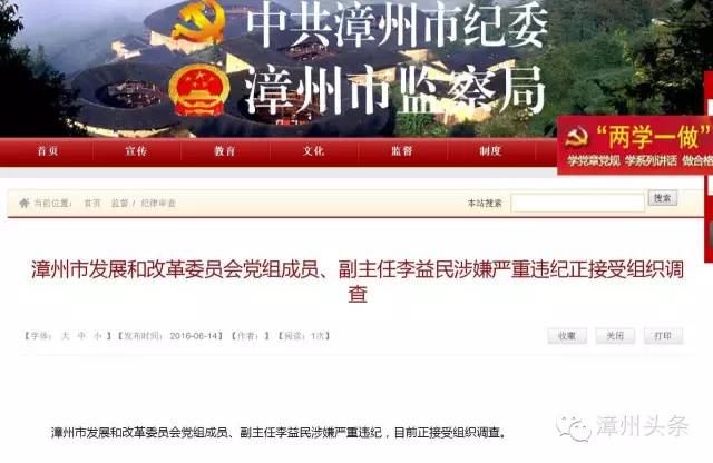 漳州頭條從中共漳州市紀委、漳州市監(jiān)察局網(wǎng)站獲悉,州市紀委今天早上剛剛權(quán)威發(fā)布,漳州市發(fā)展和改革委員會黨組成員、副主任李益民涉嫌嚴重違紀,目前正接受組織調(diào)查。