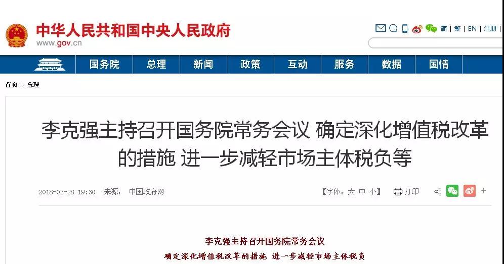 2018年3月28日國務(wù)院常務(wù)會議決定,將制造業(yè)等行業(yè)增值稅稅率從17%降至16%,將交通運輸、建筑、基礎(chǔ)電信服務(wù)等行業(yè)及農(nóng)產(chǎn)品等貨物的增值稅稅率從11%降至10%,預(yù)計全年可減稅2400億元。